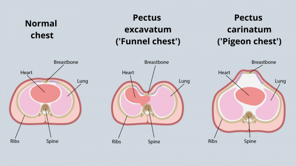 The two most common chest deformities are called pectus excavatum (‘funnel chest’) and pectus carinatum (‘pigeon chest’). They occur when the breastbone – which runs down the centre of the chest – sinks in (funnel chest) or protrudes out (pigeon chest) of the chest.