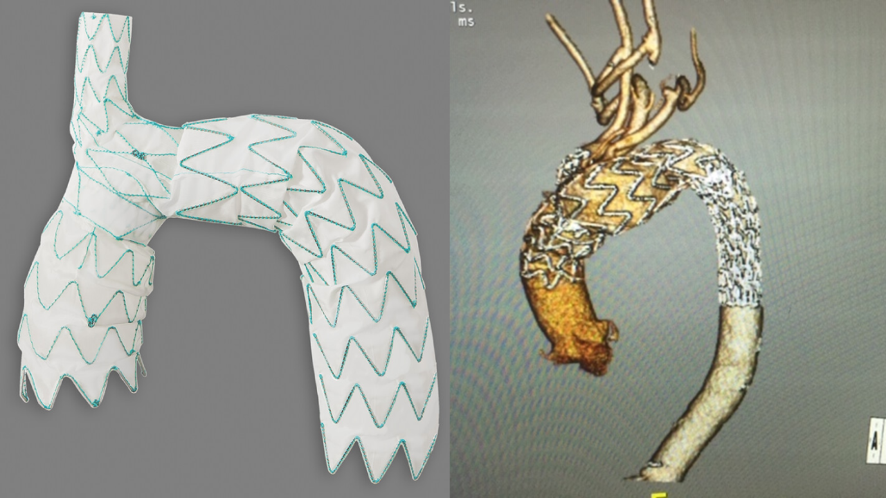 The NexusTM Stent Graft System (left) transforms a complex open-heart surgery to repair an aortic arch aneurysm into a standard keyhole procedure. The multi-part stent is customised to fit each individual patient optimally and is the first branched stent system to treat disease of the aortic arch. A 3D CT scan (right) shows the stent placed in the patient’s aortic arch.